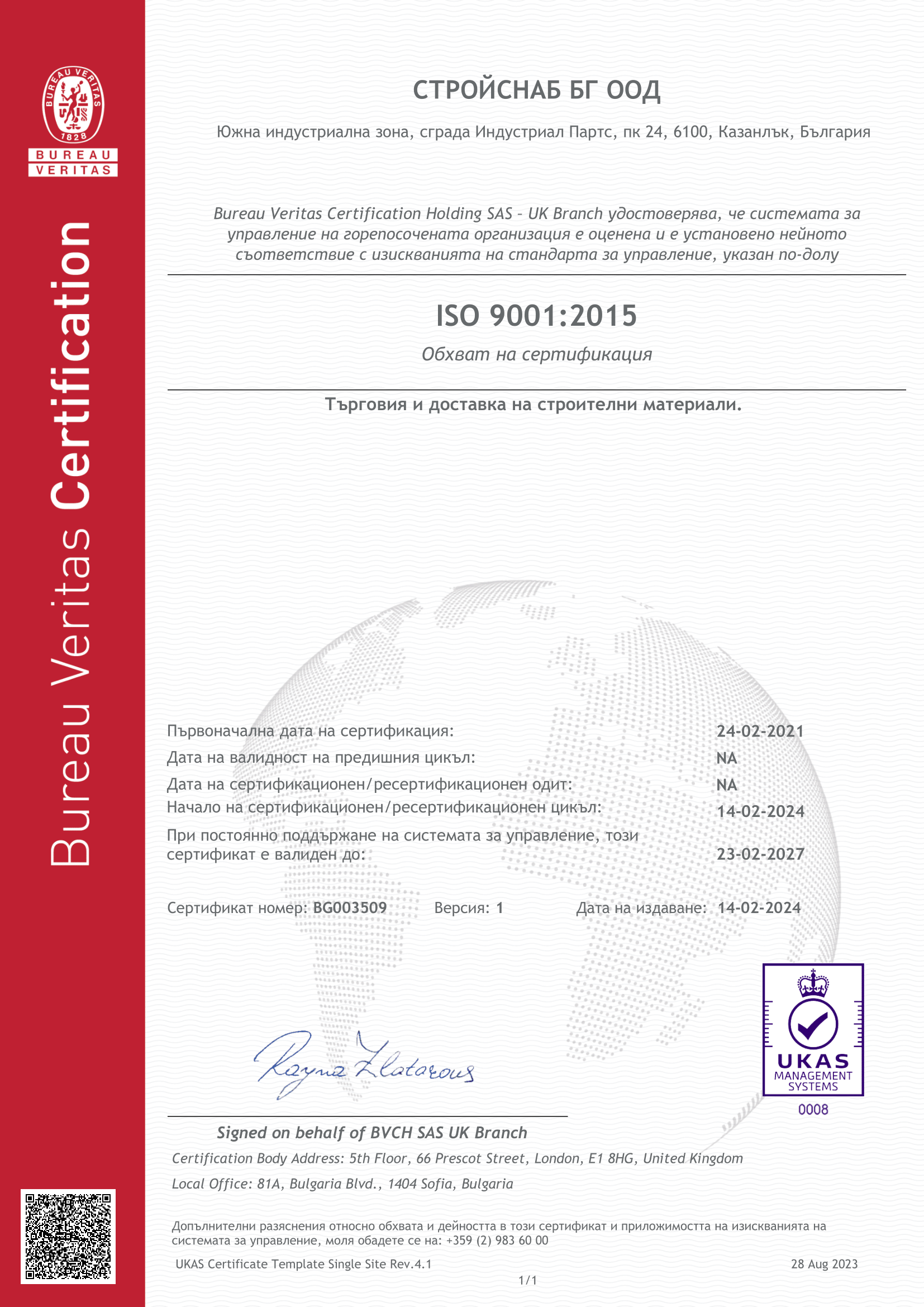 Компанията е ориентирана към по- добра удовлетвореност на клиентите и повишена ефективност на работата. През месец Февруари 2021 г. “Стройснаб БГ” ООД защити своята система за осигуряване на качеството и получи от Bureau Veritas Certification своя сертификат съгласно най-новата ревизия на стандарта EN ISO 9001:2015, влязла в сила от 2015 г. Сертифициращият одит по EN ISO 9001:2015 за осигуряване на качеството премина успешно и без повдигнати несъответствия.